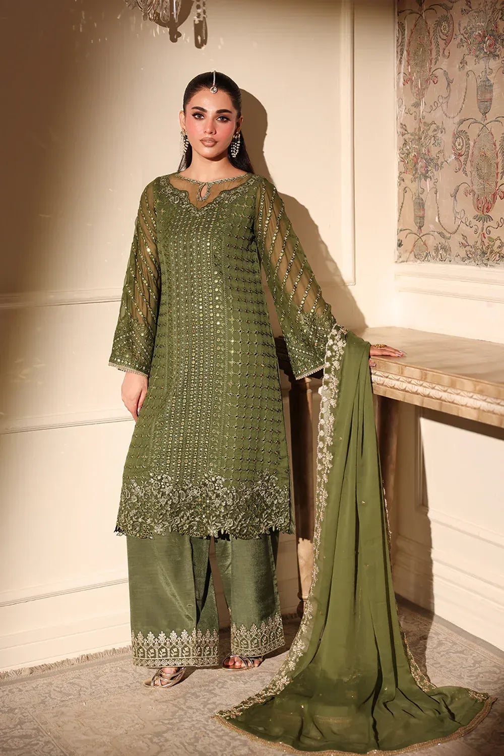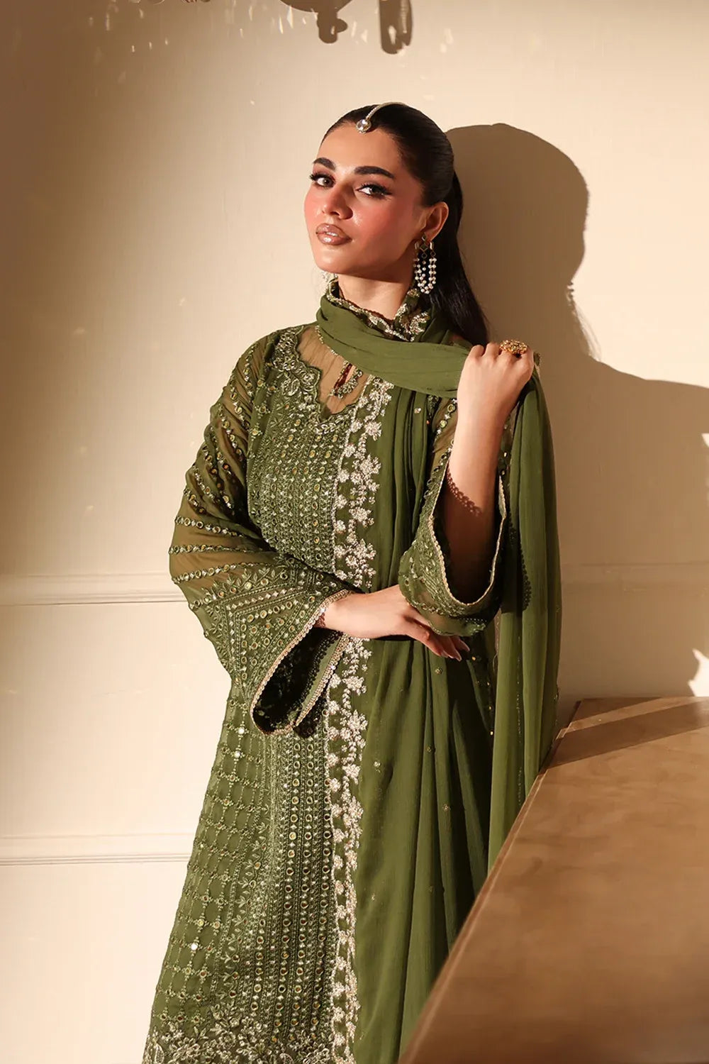 This luxurious ensemble showcases rich embroidery paired with dazzling 9mm sequin accents, creating a premium formal look. From its heavily detailed chiffon front and sleeves to the beautifully embellished dupatta and malai trouser with embroidered bunches, every piece is crafted for elegance and sophistication.